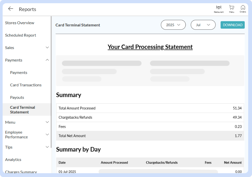 A complete statement of all transactions processed via card terminals. Essential for reconciling with your payment providers.