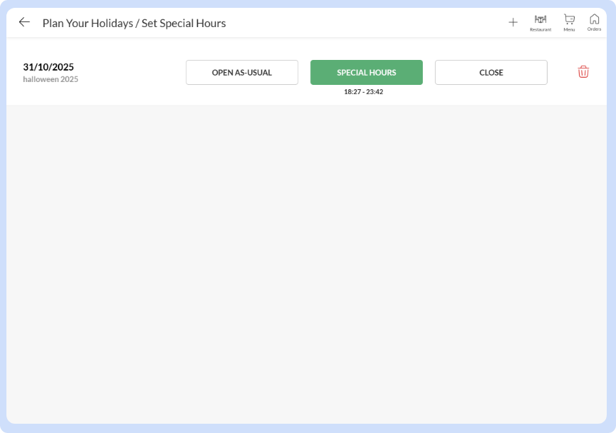 Mark holidays and special closures in advance. Automatically disables order acceptance during those days.