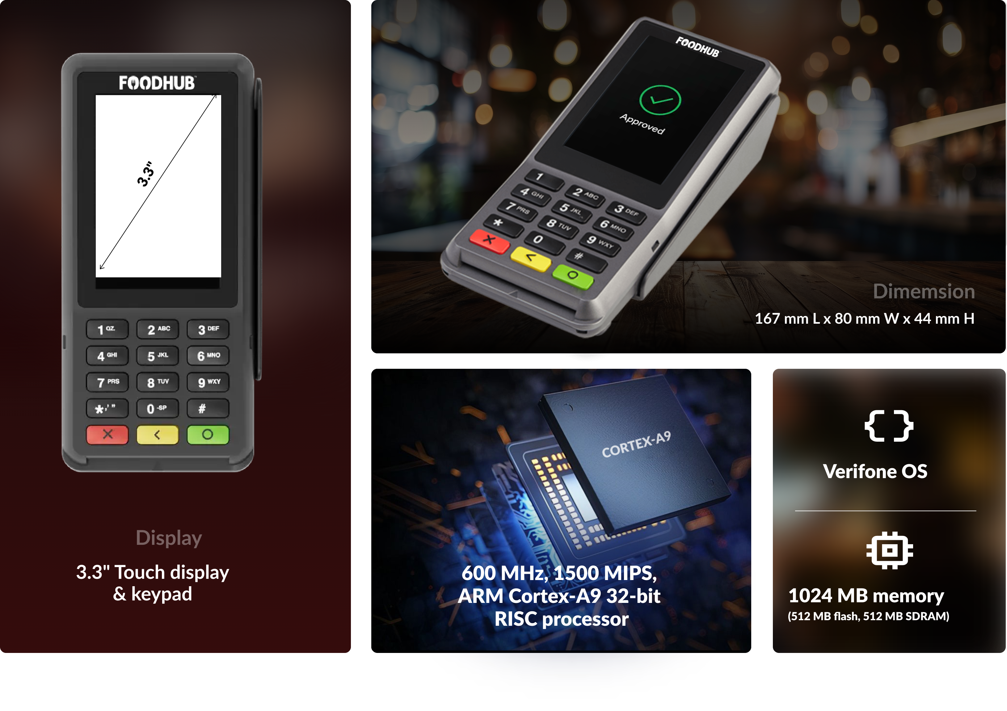 Supports WiFi and optional NFC connectivity to enable uninterrupted, real-time payments. With NFC connectivity, take advantage of Foodhub's Tap2Pay service for quick transactions.